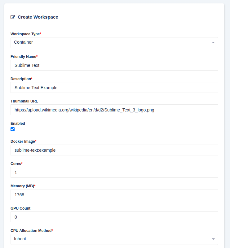 Log into the Kasm UI as an administrator and register a new Workspace by selecting the Workspaces panel and clicking on Add Workspace (It is also possible using the three dot menu to clone the configuration of an existing workspace)