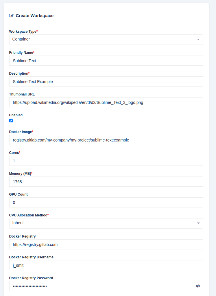 Register the image in Kasm by creating a new Workspace pointing to the docker image. Enter the gitlab username in the Docker Registry Username field and the Gitlab password or access token under the Docker Registry Password field