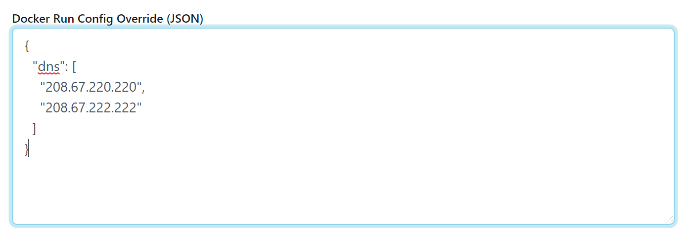 The following instructions demonstrate how to configure custom DNS servers using the Docker Run Config Workspace Setting