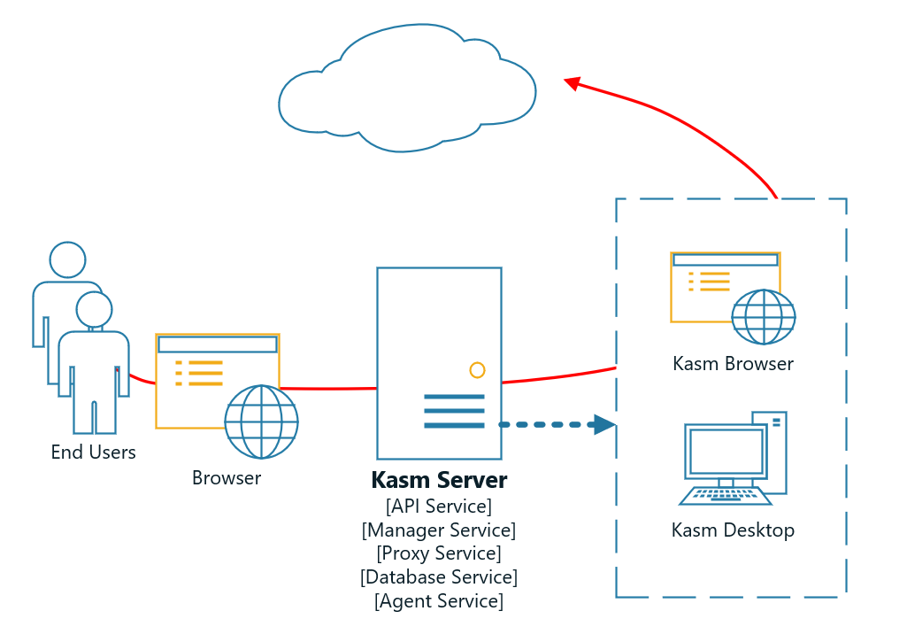 The simplest way to deploy Kasm Workspaces is to install all application services on a single server. End-user sessions will also be provisioned on this server. All interior docker communication occurs within the single server and there are no special configurations required.