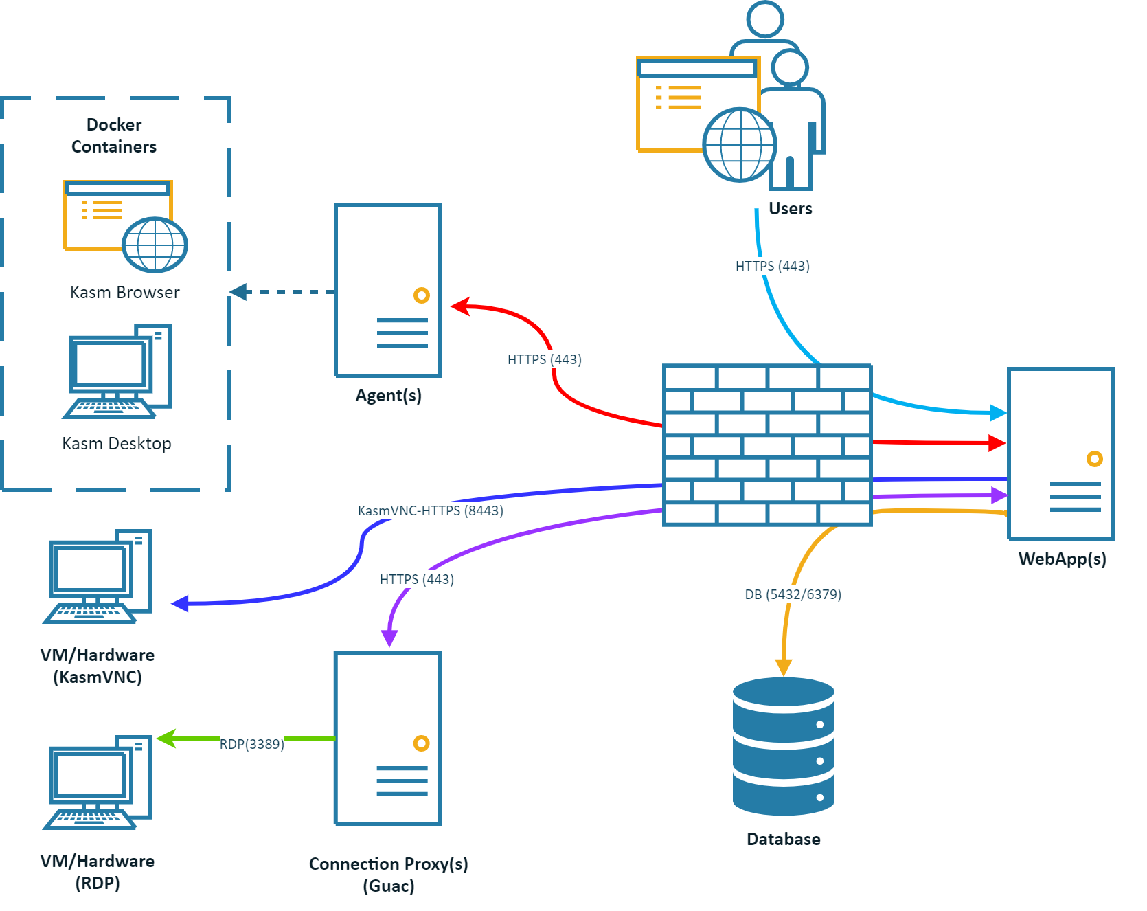 In this example, the Kasm services are installed on different servers within the environment. Depending on the desired use case, these servers can be put in separate network enclaves according to your environment and typical security best practices.