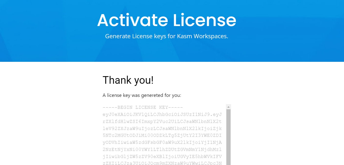 To license an existing Kasm Workspaces installation you will need the activation key that was provided when purchasing your Kasm Workspaces license.