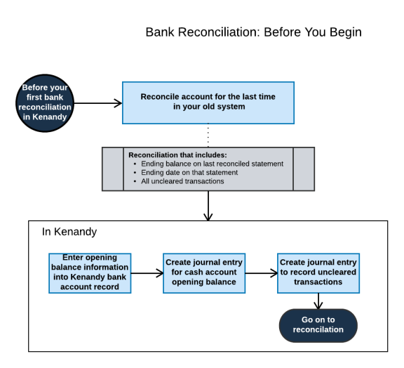 Before you reconcile a bank account in Kenandy for the first time, you must complete a number of tasks.