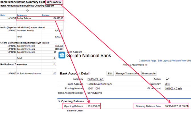 In the example account, if you don't want to create transactions reconcile the outstanding transactions in Kenandy, you'd enter $1650.00 in Balance Offset.