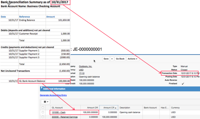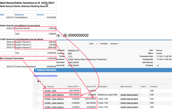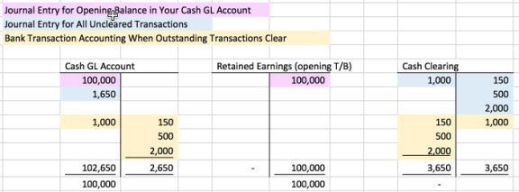 The GL bank account opening balance that you just posted has already been increased/decreased by the amounts of the outstanding transactions. Creating this JE moves those amounts out of your Cash account and into your Cash Clearing account, where they can be accurately matched and reconciled when you first reconcile this bank account in Kenandy.