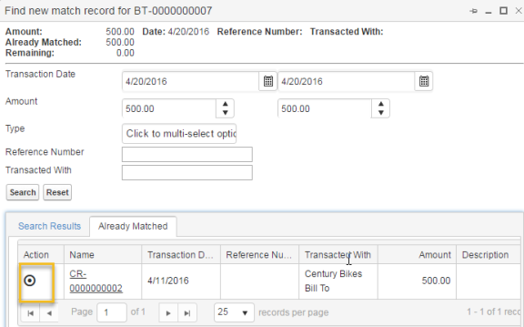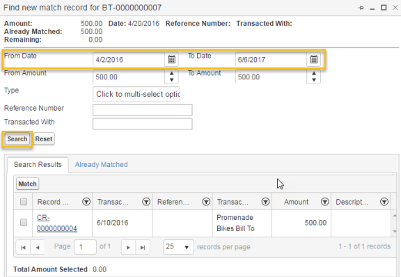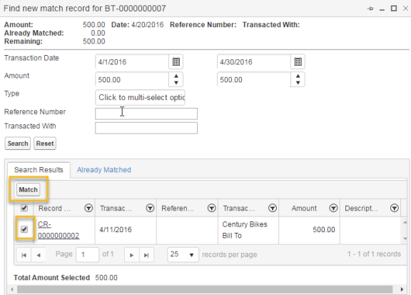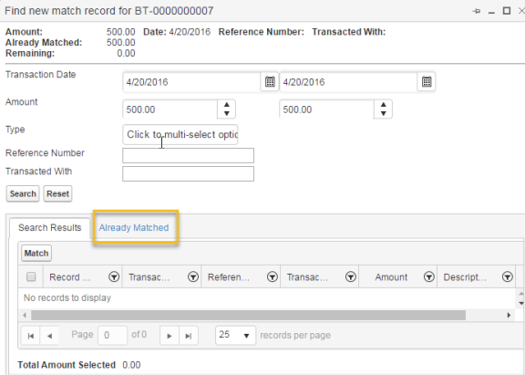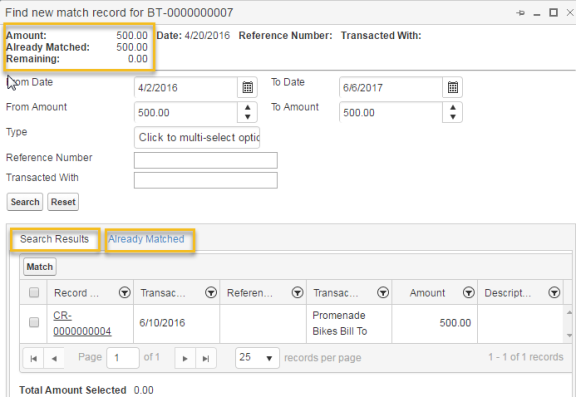 The Search Results tab shows unmatched source documents that might be valid matches for the bank transaction according to the search criteria, and the Already Matched tab shows matched source documents for the bank transaction. Only source documents that are accounted without exceptions are available to match. To lean more about fields that are displayed for each record in these tabs, see the step applicable to partially matched partial bank transactions in Automatically Match Bank Transactions to Source Documents.