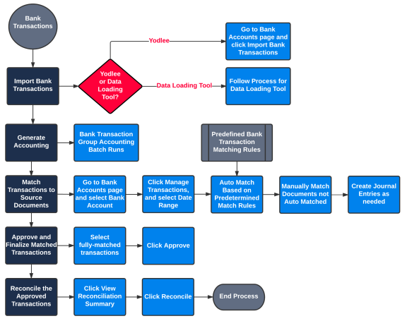 After you approve matched bank transactions, you reconcile the approved transactions. To learn more, see Reconcile Approved Bank Transactions.