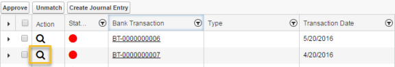 For the displayed bank transactions that have a Status field value of Fully Unmatched (denoted by a red dot), you must take further action because the bank transactions are not matched to source documents. For displayed bank transactions that have a Status field value of Partially Matched (denoted by a yellow dot with a check mark in it), you must take further action because the bank transactions are potentially matched to source documents.