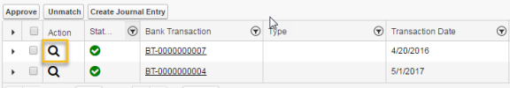 All imported bank transactions from Yodlee are displayed on the Bank Transactions page, and these bank transactions have a Yodlee value in the Source field and a reference in the Source Transaction ID field. Do not edit or delete bank transactions on the Bank Transaction detail page. You can also view imported bank transactions on the Manage Bank Transactions page after you search for them. After you match bank transactions to source documents and create journal entries for them, the matched documents are displayed with the associated bank transactions on the Manage Bank Transactions page.