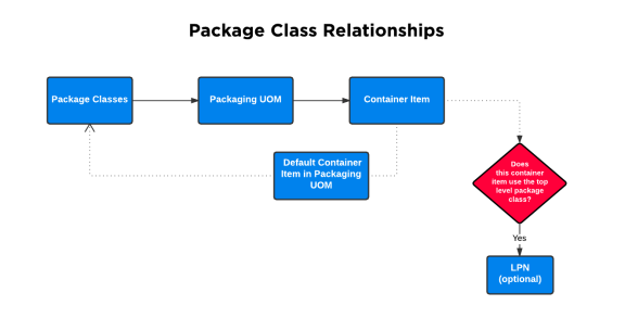 When you create container items, you need package classes set up so you can assign them to the container items. License Plate Numbers (LPNs) can be used to track container items in the top level of the package class hierarchy.