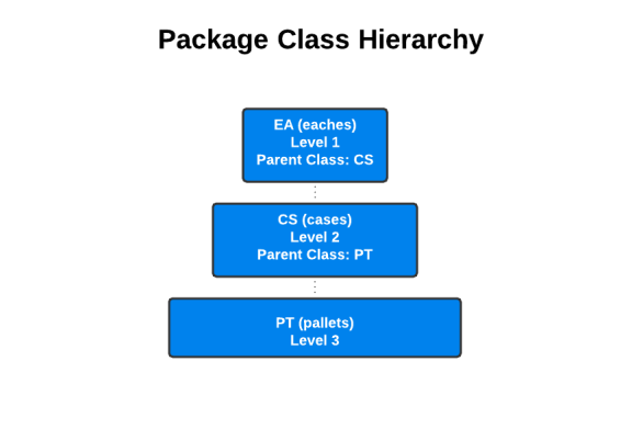 Package classes create a hierarchy of packaging UOMs that describes how items are packed and stored in your warehouse.