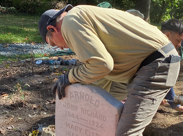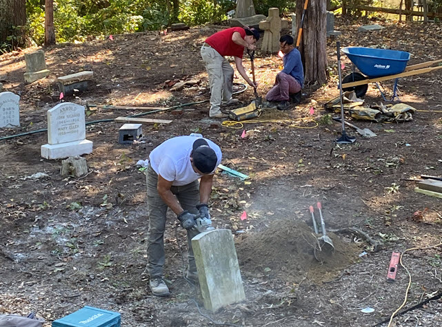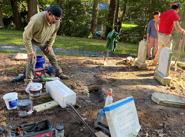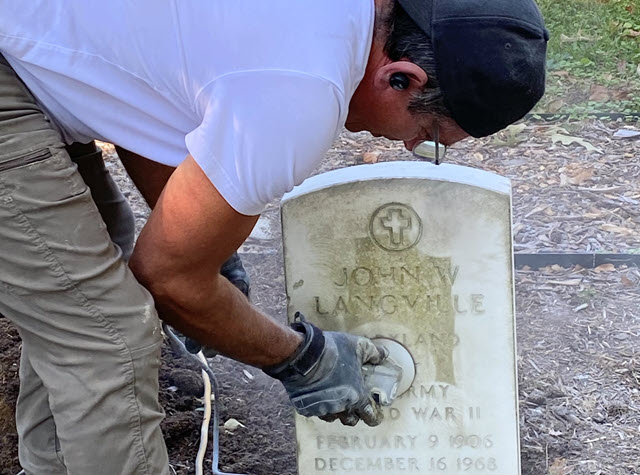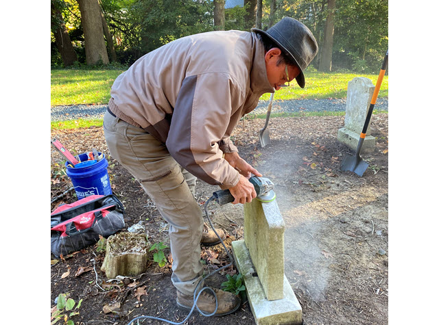The Langley Cemetery Association this summer surveyed, assessed, and prepared a plan to address the most pressing needs for grave conservation. Guiding that work was Andy Del Gallo, of Manassas, VA, a noted sculptor and monument maker and restorer, with significant volunteer support from Michael Replogle, President of the Langley Cemetery Association.