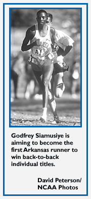 OVERVIEW: Arkansas was supposed to be too young to contend for the 1995 team title. The Razorbacks didn't just contend; they won. This year, with a slew of returnees, Arkansas should do what they're supposed to: win again. Led by defending individual champion Godfrey Siamusiye, coach John McDonnell's squad is favored to win its sixth championship in seven years. Siamusiye, vying to become the first Arkansas runner to win consecutive individual titles, headlines a squad that includes the top five runners from last year's championship team. Also returning are Ryan Wilson (who finished fifth individually in 1995), Sean Kaley, Phillip Price and Matt Kerr .... Challengers to the Razorbacks include Northern Arizona and Stanford. No. 2-ranked Stanford recently positioned itself as a title contender by winning the Pre-NCAA Invitational last month at Arizona. Stanford is led by Greg Jimmerson (23rd overall in 1995), Nathan Nutter and twin brothers Brent and Brad Hauser. Northern Arizona, runner-up at last year's championships, attempts to improve one spot in 1996 behind twin brothers Tim and Theo Martin and John Howell .... Colorado and Nebraska also should have an impact on the team standings. The Buffaloes are paced by senior Clint Wells, while the Cornhuskers rely on Cleophas Boor and Jonah Kiptarus, among others.