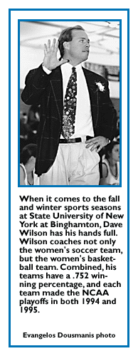 For the past five years, Wilson has coached both the women's soccer and women's basketball teams at the State University of New York at Binghamton -- and coached them well. Since 1994, his teams have achieved a combined winning percentage of .752, with each team earning NCAA playoff berths in 1994 and 1995.