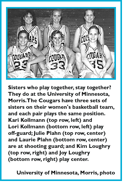 Kim and Joy Loughry both play center. Julie and Laurie Plahn are at shooting guard, and Kari and Lori Kollmann both play off-guard.