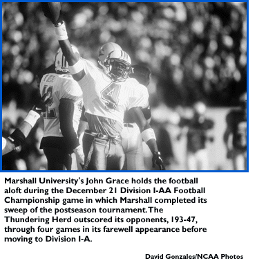 The Herd's 49-29 victory over defending champion Montana in the Division I-AA Football Championship title game December 21 capped a stunning run through the playoffs. Marshall outscored its opponents, 193-57, through four games and prompted observers to ponder whether it was the best team the division has ever seen.