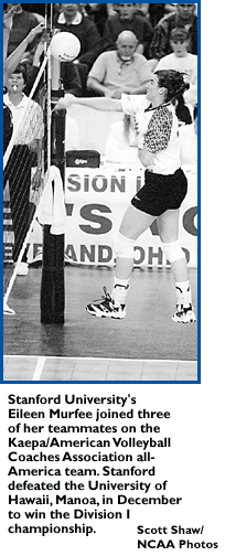 Division I champion Stanford placed four players, including first-team selections Kerri Walsh and Lisa Sharpley. Walsh was named the Division I championship's most outstanding player after Stanford downed Hawaii in three games in the title match. Sharpley was picked as a first-team setter for the second consecutive year.