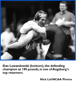 Overview: The two 'Burgs -- Augsburg and defending champion Wartburg -- stand atop the rankings just as they did at the end of last year's championships, except Augsburg currently is ranked No. 1. The Auggies, who recently won the Minnesota Intercollegiate Athletic Conference dual-meet tournament for the seventh straight time, are led by defending 190-pound champion Dan Lewandowski and Henry Gerten, who is ranked third at 118 pounds. Gerten, who finished fourth in last year's championships, is 36-0 and was most outstanding wrestler at the All-Lutheran Tournament and the St. Cloud State Invitational. Augsburg outscored Wartburg at the recent seven-team All-Lutheran Tournament, 170-1351/2, and also won a dual meet between the rivals, 17-15 ... Wartburg is led by defending 126-pound champion Tom Smith, who is 29-2. Two other Knights hold the top ranking in their weight classes -- two-time all-American Dusty Rhodes (27-5 at 134 pounds) and Mike Alesch (22-6 at 167), a runner-up last year ... Defending 150-pound champion Chris Potter leads the College of New Jersey, which is 14-1 in dual meets. The Lions also have Vinnie Santaniello, who is ranked second nationally at 134 pounds. If the Lions are to contend for their first title since 1987, 126-pound Anton Atterbury, who was a 1995 runner-up, and Dan O'Cone, a runner-up at 158 pounds in each of the last two years, probably will have to overcome nagging injuries. Neither has wrestled in 1997 ... Coach Roger Crebs has successfully blended three seniors with a bunch of youngsters into a 22-0 team at Lycoming, which has never finished better than seventh (1976). "We are looking to be a consistent top-five or top-10 team every year," said Crebs, whose team won the Division III National Duals and has beaten Springfield and John Carroll in duals. "I don't think we're at the level of an Augsburg or Wartburg." ... John Carroll and Wisconsin-La Crosse also are contenders ... One other "Burg," Brockport State's Ron Vosburg, returns this year and has jumped a weight class to 142 pounds after being honored as the outstanding wrestler at last year's championships. Another returning champion is Paul Elsen of Wheaton (Illinois) at 177 pounds. Field: A total of 200 wrestlers will compete for 10 individual championships. The team champion is determined by adding the team points scored in those matches. Dates and site: March 7-8 at Ohio Northern. Information/results: The fax-on-demand telephone number is 770/399-3060 (passcode 1905); request numbers are 1719 for bracket/schedule and 5342 for updated brackets and team scores. A list of individual qualifiers can be obtained after March 3 by dialing request number 5341. Championship results also will be available on the World Wide Web at www.ncaa.org. Results will be published in the March 17 issue of The NCAA News. Championships note: This is the first time Ohio Northern has hosted the championships.