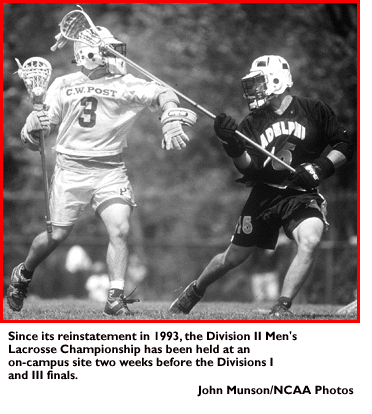 The committee agreed during a January telephone conference to recommend at the Executive Committee's May meeting that the Division II championship be combined with the Divisions I and III finals in 1998, when Rutgers, the State University of New Jersey (New Brunswick), plays host to the weekend. Division II coaches have craved the change almost since the championship's reinstatement in 1993, after an 11-year absence. "The reason ... is so we wouldn't feel like second cousins," said Vincent Salamone, director of athletics at Long Island University/C. W. Post Campus and the NCAA Men's Lacrosse Committee's lone Division II representative. Division II's one-game "tournament" has been tucked away at an on-campus site two weeks before Memorial Day weekend. Divisions I and III hold first-round games concurrently. Under the recommendation, the game would be played on the same weekend, but not on the same field. The Division II championship instead would be held at Rutgers' lacrosse field, Yurcak, on Sunday. Weather and facilities Why not go all the way and put the game in the main stadium? If Mother Nature could guarantee dry weather, the committee probably would. "Whatever happens, we don't want to wind up having any championship on a field that's been damaged to the extent that it would be difficult to play on," said John Parry, chair of the Men's Lacrosse Committee and director of athletics at Butler University. Since Division I seemingly has the most to lose by adding another game to the main field, it might be natural for its coaches to oppose the idea. But at least one, Princeton's Bill Tierney, whose team has won two of the last three Division I championships, thinks the time has come to include Division II -- and in the main stadium. "I think it would be all for the positive," Tierney said. "It is short-sighted to think one division is better than the other. "There is some concern as to what might happen on a rainy weekend, but Maryland has shown it can handle that kind of problem (staging two semifinal and two final games during a weekend). They have done a great job with it and I'm sure Rutgers will as well." Gothard Lane, former assistant director of athletics at the University of Maryland, College Park, has overseen the facilities for the past four championships weekends. As the person who may be the most knowledgeable about what is possible, he supported adding another game to the main field. "I don't see why you wouldn't do it," he said. "It's not that much of a problem for the host. What's one more game?" If the Division II game is to eventually move to the main field, artificial turf would seem a logical way to solve the weather issue. However, the championships are booked through 2002 at Maryland and Rutgers, both of which have natural fields. Even in years for which sites have yet to be chosen, suitable artificial turf choices are few. The only places in lacrosse country with the right combination of artificial turf and ample seating are Cornell University, Syracuse University and the University of Pennsylvania. Meanwhile, even as an auxiliary field solves problems, it presents hurdles of its own. Obviously, the atmosphere of the main stadium will not be duplicated. The other challenge is ticketing. The Division I semifinals and championship game and the Division III championship game are included in an all-sessions package for Rutgers Stadium, which holds 48,000 fans. Yurcak holds 5,000. "(That difference means) that game probably will not be part of the ticket package," Parry said. Calendar challenges Jack Kaley, coach at New York Institute of Technology, a perennial contender that last reached the championship in 1994, said that the "stepchild" feeling is not the only reason a Division II move will be welcomed. He said the current date of the game is problematic because it conflicts with other lacrosse events (in addition to the other divisions' tournaments) and many of the potential competitors' final exams. "It's the same weekend as the junior college championship and the ECAC tournament," he said. "The fan has to make a choice and that hurts all of us (in the lacrosse community). It's also the weekend before our finals, when our kids should be studying." Ironically, academic schedules also were an argument against the move. Most of the perennial qualifiers finish their spring semester relatively early, which would force a team that advances to pay room and board for its student-athletes for an extra two weeks while the team prepares for the championship. Since many of the schools have many students who commute, such expense may be less than what might be experienced at residential schools, but still could be considerable. Kaley said the "problem" can be dealt with as it arises. "Leave it up to the individual schools, heck ... my kids would pay their own way to go to become part of this," he said. Division III success a plus All of the potential drawbacks heard during deliberations over the Division II issue also were voiced when the committee investigated whether to move the Division III championship to the weekend. By any estimation, that change, which happened in 1992, has been positive. "It's given us tremendous exposure and provided a great experience for the kids," said Scott Nelson, coach at Nazareth College, which won last year's Division III title. "Everything has been first-class." That success is magnified by the attendance figures. Before it was part of championships weekend, the largest crowd for the Division III game was 4,205. Although the actual number of fans in the stadium was lower because of inclement weather, the paid attendance last year was 18,586 -- a Division III championship record for any sport. The committee hopes that a Division II move would increase crowds in a similar manner, although that much of a jump obviously would not be possible unless the game eventually moves to the main facility. You still can't remember who won last year's Divisio