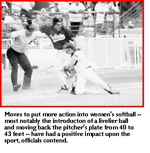 Utah finally won, 4-3, to clinch a spot in the NCAA Division I Women's Softball Championship. The teams were on the field for 12 hours -- 6 p.m. May 11 through 6 a.m. May 12. Only eight runners crossed the plate -- not even an average of one runner an hour. Mary Higgins, Creighton's coach at the time, and former Utah coach Jo Evans can't even remember the scores of the games. "My parents," Evans joked, when asked if there were any fans left in the bleachers. Higgins said her son -- 6 years old at the time -- awoke to ask, "Hey, did we win the game?" A real snoozer. Dealing with perception Six years later, women's collegiate softball appears to be dealing with the perception that its game lacks offense and action. Last year's NCAA championship finals saw teams combine for 10 runs each in Divisions I and II and nine runs in Division III. Conversely, in 1982 -- the first year the NCAA sponsored softball championships -- the Divisions I and III final scores both were 2-0. The Division II champion won, 3-2. "I think the two moves that have changed the game were moving the mound back and the new ball," Arizona coach Mike Candrea said. "I personally think that it's helped us market our game because people are scoring runs. There's more action. It put the home run back in the game. I think those things have been great for the sport. "The extra-inning games you see are 4-4 instead of 1-0. These moves have put a premium on defense again. The more we've played with the ball, the more we've realized you have to have good pitching and good defense. Just about everyone can put the ball in play." Wildcat hitters certainly put the ball in play. Arizona players are ranked eight times among the top 10 Division I single-season run-scorers. Laura Espinoza specialized in putting the ball out of play. The Arizona letterwinner swatted a record 37 home runs in 1995. Just 10 years before, the single-season record was 18. More zip -- literally As Candrea said, a combination of rules changes over the last seven years has worked to put a little more zip in softball -- literally. In 1988 the pitcher's plate was moved to 43 feet -- back from the 40 feet mandated by Amateur Softball Association fastpitch softball rules. In the following years, the Divisions I, II and III Women's Softball Committees tinkered with fence distances, first recommending and then requiring 190-foot distances in left and right fields and 220 feet to center for regionals and championship finals. And in 1993, the softball committees voted to require use of an optic yellow ball with raised red seams for championship competition. Oh, and the ball is livelier, too. "The ball is extremely lively. If the goal was to make the game more exciting -- get more hits -- they definitely did that," Evans said. "Now the problem is the games are longer. Before, you could get through a game in one hour and 15 minutes. Now these games are going two hours. "So there are tradeoffs." Candrea adopted a "wait-and-see" attitude when the livelier ball was introduced in 1993. He's seen, and now he's a believer that the ball has spiced up the game, and in turn, brought fans to the ballpark. "Only the purist really loved the 0-0 game for 16 innings," Candrea said. "It's a really tough thing to market, television-wise. We're not where we need to be as far as the media are involved, but I think it's a great game right now." Effect on pitchers Pitchers bear the brunt of the rules changes. UCLA's Debbie Doom pitched 102 consecutive scoreless innings in 1984. In the last five years, the most consecutive scoreless innings pitched were by the Bruins' Lisa Fernandez and DeeDee Weiman, who both shut out opponents in 65 straight innings in 1992. "The dominant pitcher can still be dominant, but the term 'dominant' may have changed a little bit," Candrea said. "Instead of getting 12 strikeouts, they may get six, and their team will have to play defense." Candrea concedes that extra hitting and scoring lengthen what used to be a tidy 75-minute game. "That's maybe not the good part of it," he said. "But if you look, attendance around the country is up. I think it's because people come to see action. They don't want to see a 0-0 ballgame."