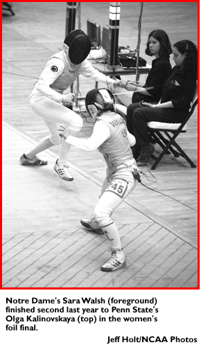 Overview: Despite the departure of four-time women's foil titlist Olga Kalinovskaya, two-time champion Penn State remains the team to beat. The Lions are likely to qualify 10 fencers -- two in each weapon, the maximum possible -- which is a tremendous advantage because team scoring is based on individual results. The best of the rest will struggle to qualify eight or nine competitors. The top challengers are likely to be Notre Dame, St. John's (New York) and Stanford, a team that's just right for this format because it has one or two top-notch fencers in each weapon but lacks overall depth ... Despite the return of 1996 champions Jeremy Kahn of Duke in men's epee, Maxim Pekarev of Princeton in men's sabre and Nicole Dygert of St. John's in women's epee, the individual titles are a toss-up once again -- newcomers always make an impact. But several Penn State fencers are likely to be near the top, most notably men's sabre runner-up Serge Lilov, Jeff Feinblatt in men's epee, and Alexandra Korfanty in women's foil ... The most competitive event probably will be men's foil. The talent is so deep across the country in this weapon that several top-quality foilists have moved to different weapons for the collegiate season ... Notre Dame's hopes would get a big boost if Sara Walsh, who lost to Kalinovskaya in last year's gold-medal bout, can regain the form she displayed in a round-robin defeat of the eventual champion. Other Irish to keep an eye on include freshman Magda Krol in women's epee and three-time all-American Jeremy Siek in men's foil ... Air Force serves as the site of the NCAA fencing championships for the first time since 1971, when it hosted the men's championships. The last time an NCAA fencing tournament was held west of the Mississippi River was 1982, when San Jose State hosted the women's championship.