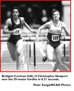 55-meter hurdles: 1. Bridgett Cochran, Chris. Newport, 8.21; 2. Monique Hacker, Binghamton, 8.31; 3. Rochele Meyer, Baldwin-Wallace, 8.35; 4. Kelly Schoberg, Wis.-La Crosse, 8.37; 5. Kristen Donato, Springfield, 8.39; 6. Jennifer Gilmartin, Chris. Newport, 8.40.