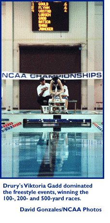 Gadd's win in the 500-yard freestyle helped Drury post a huge lead after the first day's events. Drury swept the top three spots and scored 75 points in that event alone. Gadd also placed second in the 50-yard freestyle to Jamie Minnich-McDaniel of Ashland, who prevented Gadd from defending her 1996 crown in the sprint.