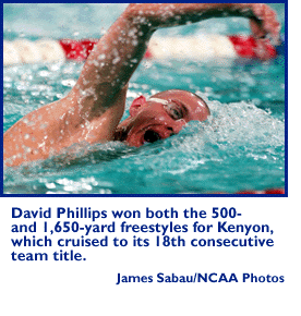1,650-yard freestyle: Final--1. David Phillips, Kenyon, 15:43.48; 2. Jason Boettner, UC San Diego, 15:45.32; 3. Matt Feinberg, Binghamton, 15:48.55; 4. David Tudury, UC San Diego, 15:52.52; 5. Torsten Seifert, Kenyon, 15:55.04; 6. Tim McAteer, UC San Diego, 16:06.36; 7. Erik Siegfried, Redlands, 16:10.74; 8. Jeff Fellows, Denison, 16:13.39; 9. D. J. Postles, Hamilton, 16:14.56; 10. David Reid, UC Santa Cruz, 16:15.64; 11. Corey Ryon, Cortland St., 16:18.04; 12. Mark Beiter, UC San Diego, 16:18.92; 13. Jeffrey Hundt, Allegheny, 16:18.93; 14. Brian Kirkvold, Kenyon, 16:23.81; 15. Jeffrey Clark, Wheaton (Ill.), 16:24.88; 16. Patrick Burton, Williams, 16:25.06.
