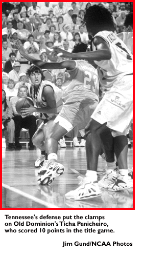 Half time: Tennessee 34, Old Dominion 22. Three-point goals: Tennessee 3-5 (Jolly 1-3, Conklin 2-2), Old Dominion 4-18 (Andrade 0-3, Penicheiro 0-1, Eller 1-2, Eblin 3-10, Diaz 0-2). Disqualifications: Andrade, Machanguana. Officials: Dee Kantner, Violet Palmer, Yvette McKinney. Attendance: 16,714.