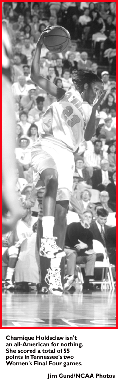 In the title game, all-American sophomore Chamique Holdsclaw led the way with 24 points and seven rebounds. Guard Kellie Jolly contributed a championship-game record 11 assists and had a Final Four record of 20.