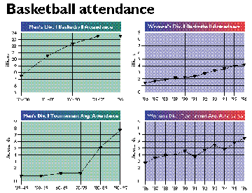 Men's regular-season attendance has been level since 1993, but crowds at the Division I Men's Basketball Championship have leaped since the beginning of the decade. Attendance for the 1997 tournament was 634,056, with a per-session average of 18,649, which is the fifth-highest average ever. Women's totals have grown steadily since the beginning of the decade, with regular-season totals surpassing the four-million mark for the first time in 1996. Women's tournament totals for 1997 have not been determined yet. From 1990 to 1996, attendance for the women's Division I tournament increased more than 40 percent.