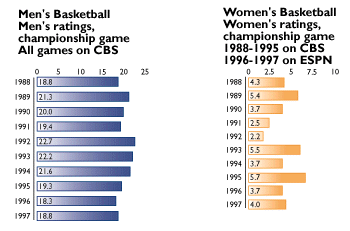 Television ratings for the 1997 Division I Men's and Women's Basketball Championships were up compared to 1996.