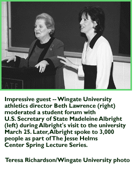 In between the two events, the 77-year-old coach has built a lifetime around coaching Curry baseball. After an 8-6 victory over Bates College March 29, his career record stood at 700-259-4 -- a lifetime winning percentage of .729. The landmark victory, accomplished in his 50th season, was marked by an on-field presentation by Curry President Ken Quigley and then the sharing of a special "victory cake" in the school gymnasium with more than 60 friends, family and former players -- many of whom he remembers with amazing clarity. "The people are what I remember," he told the Boston Globe. "Harry Goetz out of Middletown, Connecticut, pitched my first victory in 1948, against Boston State College at Fens Stadium. Mike Higgins of Hyde Park pitched my 500th. The yardstick isn't numbers, it's how much the kids have improved, how much have you helped them physically and mentally? How much good have you done?" Senior captain Mike Mancuso told the Globe that Vallely is the ideal role model. "I mean, he's 77 years old and the other night, he and Brian (assistant coach Brian Vallely) worked with me in the batting cage in the gym until 2 a.m.," Mancuso said. "Their door is always open to you. What I've learned most from Coach is in games when we're actually losing. He'll remind us that if we just throw in the towel and quit, we might be tempted to do that in other things we do." Water can't pin wrestlersFirst-year Longwood College wrestling coach Brent Newell may want to add fishing waders to his equipment budget next year after a recent travel experience. Leaving the Division II East wrestling regionals in Indianapolis, the Lancers were heading south toward Louisville to find rooms for the night. What they found instead, though, was cars driving through flood waters on Interstate 65. The coaches tried to find an exit, but the vans became stuck. "Luckily, we stopped on a slight ridge," Newell said. "The team could see the water rise along the drainage ditch. It was really scary." Knowing that their vans were on slightly higher ground, the team jumped into action to assist other stranded motorists. The entire team waded through water, sometimes waist deep, to help in getting some stranded passengers out of their cars and into National Guard rescue vehicles. The team managed to reach its motel, although not until 5:30 a.m. The next day, the wrestlers saw their stranded vans -- high and relatively dry -- on a television newscast. The coaches made arrangements to get back to the vans, and 13 hours later, they were back home in Farmville, Virginia. Mighty mitePrincipia College may be tiny, but that does not keep the Division III institution from following through on its commitment to a broad-based sports program. With 17 athletics teams serving a student population of only 500, the Elsah, Illinois, school appears to rank No. 1 among Division III institutions (and probably all NCAA members, as well) in the ratio of teams to students. From time to time, Principia also has offered student-athletes another experience: a national championship. Panther teams have won five of them through the years. "We're pleased to have such a variety of sports to offer our student body and we feel that it's a very important aspect of our educational program," athletics director Seth Johnson said. Let's play threeTwice this season, the Trinity University (Texas) baseball team has found itself in the unenviable position of having to play three games in a day. And twice the Tigers have made the most of a difficult situation. The first time was March 24 as part of the Trinity Classic Tournament, when the Tigers defeated Carleton College, 13-2; St. Olaf College, 14-4; and Doane College, 3-1. The second trifecta was brought about by Mother Nature when Trinity had to play three games against Rhodes College April 6 because of a rainout the previous day. The Tigers won, 19-7, 6-4 and 10-4. Trinity may want to consider making the tripleheader a more routine occurrence. The Tigers are 6-0 on three-game days this year, but 10-14 in their other 24 games. -- Compiled by David Pickle |