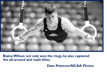 Wilson, who claimed one individual title and shared two others in 1996, claimed three individual-event titles, winning the all-around and rings crowns for the second consecutive year and adding the vault title.