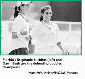 Overview: Florida and Stanford finished first and second, respectively, in 1996. The two teams should battle for bragging rights again at this year's event. Florida is the nation's No. 1-ranked team after winning its first 25 team matches, including a February 23 meeting against Stanford in the Rolex Indoor Championships team final. The Gators are led by Dawn Buth, Divya Merchant, Bonnie Bleecker and Stephanie Nickitas. Buth and Nickitas, defending doubles champions, combine to form the nation's No. 2-ranked doubles tandem behind Stanford's Ania Bleszynski and Julie Scott .... Stanford also showcases Katie Schlukebir and Sandra De Silva. Schlukebir, the 1997 Rolex Indoor Championships singles champion, is the nation's No. 2-ranked singles player .... UCLA and Duke, semifinalists in 1996, should again be in the hunt for the title. The Blue Devils are led by No. 1-ranked singles player Karin Miller, a freshman.