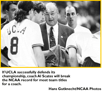 Overview: Two-time defending champion UCLA is ranked No. 1 again in the American Volleyball Coaches Association poll. The Bruins' 20-3 record includes triumphs over national challengers Brigham Young, Hawaii, Pepperdine and Stanford. Coach Al Scates, now in his 35th year at the helm, earned his 900th career win earlier this season against Southern California and has produced 16 championship teams, tying former Houston golf coach Dave Williams for the most NCAA team titles for a coach. This year's Bruin squad features Paul Nihipali, who is ranked among national leaders in kill average, and Tom Stillwell, who leads the country in blocks. UCLA's losses have been to Pepperdine, UC Santa Barbara and Penn State .... The Nittany Lions, champions in 1994, have won a school-record 22 consecutive matches heading into the Eastern Intercollegiate Volleyball Association tournament, where they likely will tangle with Princeton, winner of 21 straight matches. Penn State leads the nation in hitting percentage and is ranked second in the AVCA poll with a 27-1 record .... In the Mountain Pacific Sports Federation, third-ranked Stanford will challenge UCLA behind outside hitter Mike Lambert (478 kills) and setter Stewart Chong (18.32 assists per game). Stanford, however, probably will first have to beat Pepperdine and Brigham Young, both ranked in the AVCA top five .... In the Midwestern Intercollegiate Volleyball Association, top seed Ball State is favored to stave off challenges from Ohio State and Lewis.
