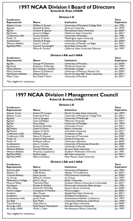 In addition, term rotations for members of the Division I Board of Directors and Management Council have been announced (see accompanying tables).