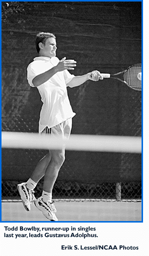 Overview: UC Santa Cruz has won the last two team titles and looks to become only the second team in championships history to win three in a row. The Banana Slugs, who have finished first or second at seven of the last eight championships (winning three), are led by Brian Cummings, Josh Goodly and Thomas Oechel. Cummings and Oechel combine to form the Banana Slugs' No. 1 doubles team .... UC Santa Cruz will face strong challenges on all fronts in its bid for a third championship. Kalamazoo, Emory, Washington (Maryland), Gustavus Adolphus, Williams and Redlands all have viable shots at the top spot. Seven-time champion Kalamazoo, which placed third in 1996, is vying to return to the winner's circle after a three-year hiatus. The Hornets boast a lineup led by veterans Pat Noud and Adam Norlander. Noud teams with Chris Kennelly on the squad's No. 1 doubles team, while Norlander combines with Dan Harding .... Washington (Maryland), which claimed the 1994 title, has its sights set on adding its second championship. The Sho'men are experienced and talented with a lineup that includes Damian Polla, the 1995 singles champion; Miroslav Beren; and Michael Kember .... Emory, which placed second in 1996, is led by veterans James Oliviero and Jed Weinstein, while Gustavus Adolphus, fourth in 1996, returns Todd Bowlby, 1996 singles runner-up; Adam Beduhn; and Noel Stout.