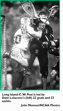 Overview: Defending champion Long Island-C. W. Post, Adelphi and New York Tech are fighting for the championship's two berths (most of the trio's head-to-head games were played after this issue of The NCAA News went to press). Post has lost only to defending Divison III champion Nazareth, but faces Tech and Adelphi in its last two games. The Pioneers, who jumped to their best start since 1985, are led by Dave Loiacono, who had 22 goals and 23 assists through eight games. Goalie Vin Fredericks returned to school after a two-year absence and has manned the nets admirably, posting a .671 saves percentage and a 6.95 goals-against average. With the exception of the Nazareth loss and a 6-3 win over Pace, all of the Pioneers' scores have been one-sided .... Adelphi, which has appeared in three of the last four title games, already has beaten New York Tech, 17-16. The Panthers host Post in the last game of the season. Assuming the team wins its other games, a victory should assure Adelphi of a bid. Just like Post, the Panthers' only loss came against a Division III powerhouse -- Salisbury State, 11-6. Except for three games, no team has come closer than six goals to Adelphi. Peter Friedman leads the attack with 20 goals and 19 assists. Mark Mangan has a team-best 25 goals, plus 10 assists. Rob Grella has 22 goals and seven assists. In goal, Rich Grismer has posted a .709 saves percentage .... New York Tech has not beaten Post since 1994, when the team last appeared in the title game. The Bears, who outscore their opponents by 7.5 goals per contest, are led by Joe Brock, who had 26 goals and 38 assists through 10 games. Until a recent 9-7 win over Bentley, Brock had scored a point in 21 straight games. In addition to the Adelphi setback, the Bears have lost to Salisbury State, 13-6.