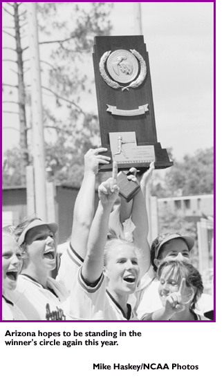 Overview: Defending champion and No. 1-ranked Arizona opened the year with a school-record 30-game winning streak. Through 52 games, the team hit .383, equal to the NCAA season record the Wildcats set in 1995. Alison Johnsen tops the Division I individual batting list at .541 .... Fresno State, ranked second nationally in the coaches' poll, was the last team to beat the Wildcats (April 6). The Bulldogs' Robyn Yorke is third all-time in NCAA hits .... No. 3 South Carolina set a single-season NCAA record for consecutive wins, taking 38 straight from February 22 to April 5. The Lady Gamecocks have won 57 games, tops in the division this year. Trinity Johnson leads the nation in strikeouts, averaging 12.0 per game .... UCLA is led by pitcher B'Ann Burns, the Bruins' career innings-pitched leader (732.1). Freshman Stacey Nuveman has a school-record 15 home runs .... Iowa was undefeated in the Big 10 Conference through 17 league games. If the Hawkeyes, who have outhit opponents by a 2-1 margin, can complete conference play with an unblemished record, it will be a Big Ten first.