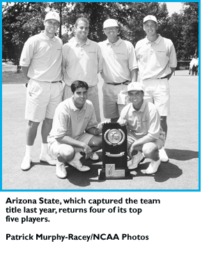 Overview: There hasn't been a repeat team champion in this event since Houston won back-to-back titles in 1984 and 1985. Arizona State is next in line to try. The Sun Devils led last year's tournament from wire to wire and return four of the five players who brought home the hardware, including Darren Angel, who tied for third overall. But it's last year's fifth man, Chris Hanell, who is this year's second-ranked golfer according to the College Golf Foundation's Rolex rankings. Hanell shot 74-68 to capture the Golf Digest Collegiate in March .... Arizona will get pressure, however, from regional challengers UNLV and Southern California. UNLV, the top-ranked team in Division I, features four golfers among the top 50. Gilberto Morales is ranked 10th; 25th-ranked Bill Lunde won the TaylorMade Big Island Intercollegiate. Ted Oh, who tied for 10th last year, also returns to help the Rebels try to top last year's runner-up finish .... Meanwhile, Southern California has won twice this year and will rely on Roger Tambellini, Chad Wright and Brian Hull to capture the Trojans' first team title .... Oklahoma State's second-ranked Cowboys won this event in 1995 and placed eighth last year. Coach Mike Holder's troops have won three tournaments this year and feature Bo VanPelt and Ed Loar, both ranked in the top eight .... Other contenders for the team crown include Clemson, Texas Christian, North Carolina, Arizona, Texas and Wake Forest. Top individuals returning include Rory Sabbatini of Arizona, Tim Clark of North Carolina State and Brad Elder of Texas.