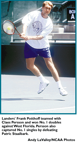 Singles -- No. 1: Claes Persson, Lander, def. Patric Staalbark, West Fla., 6-3, 7-5; No. 2: Suspended; No. 3: Suspended; No. 4: Janne Vilhunen, Lander, def. Peter Jorgensen, West Fla., 6-2, 6-3; No. 5: Suspended; No. 6: Maurice Szpydowski, Lander, def. Jorn Hope, West Fla., 6-1, 6-2.