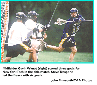 After Eugene Curran gave Adelphi an 8-7 edge 27 seconds into the third quarter, New York Tech scored four of the next five goals to take command. Adelphi's Rob Grella tallied a goal 50 seconds into the fourth quarter, but the Bears outscored their hosts, 7-1, down the stretch for the title.
