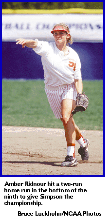 A two-run home run by Simpson freshman Amber Ridnour in the bottom of the ninth inning lifted the Storm to its first Division III Women's Softball Championship, 2-1, over Montclair State May 18 at Wisconsin-Eau Claire.