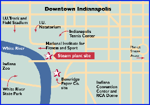 "The site is in the White River State Park currently occupied by the Indianapolis Power and Light Company generating plant. It is adjacent to the IMAX Theater and the Indiana State Museum complex.