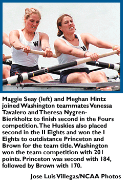A perennial power in rowing, Washington entered the NCAA's first national regatta as the clear favorite but was met with stern challenges from Princeton and Brown before taking the first NCAA team title May 30-June 1 at Lake Natoma in Sacramento, California.