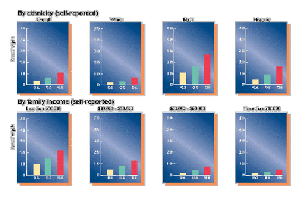 Data collected by the NCAA Initial-Eligibility Clearinghouse show a steady increase in the percentage of ineligible freshman student-athletes from the entering 1994 class (the last year with the old Prop 48 standards) to the 1995 class (an increase from 11 to 13 in the number of core courses) to the 1996 class (13 core courses, plus satisfying a sliding scale of test scores and grade-point averages). Of the 6,030 African-Americans who appeared on an Institutional Request List (IRL) in 1996, 1,625 were ineligible -- 26.9 percent. That is the highest rate recorded for any ethnic group since the analysis of the Clearinghouse data began. The ineligible rate for African-Americans in the 1995 entering class was 16.3 percent. The number of white student-athletes who were ineligible in the 1996 entering class was actually higher than the number of African-Americans who were ineligible -- 1,939 (out of 30,024 appearing on an IRL) vs. 1,625. However, the percentage of white student-athletes who were ineligible was only 6.5 percent, much lower than the 26.9 percent for Blacks in the same entering class. Increased rates of ineligibility showed across economic levels. One interesting situation related to athletes from families earning more than $80,000 per year. That group was only slightly affected by the increase from 11 to 13 core courses in 1995 (up from 2.0 to 2.5 percent) but was substantially affected by the application of the sliding scale (2.5 percent ineligible up to 4.6 percent ineligible). During the same period, the percentage of ineligibles for student-athletes from families with incomes of less than $30,000 rose more consistently, from 9.8 percent ineligible to 14.7 percent to 22.2 percent.