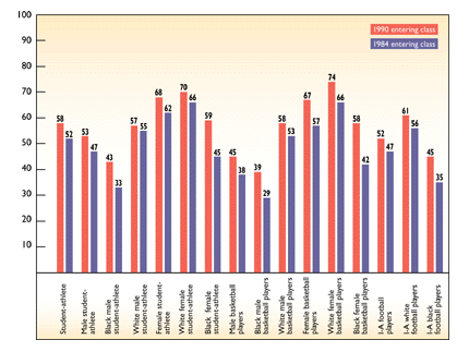 The biggest gains in Division I graduation rates over a seven-year period have been made by African-American student-athletes. A comparison of the graduation rates for the 1984 entering class of Division I student-athletes (the first to be studied) and the 1990 entering class (the most recent) shows six of 16 subgroups with increases of 10 percent or more in graduation rates. Five of those subgroups are composed exclusively of African-Americans and the sixth is largely the result of gains made by Blacks. The biggest increase for any subgroup studied was for black female basketball players, whose graduation rate went up 16 percent from the first study to the most recent one (42 percent to 58 percent). That jump helped boost the increase for all female basketball players to 10 percent (57 percent to 67 percent). Other increases in African-American subgroups from the first study to the most recent one are black female student-athletes, 14 percent, and black male student-athletes, black male basketball players and Division I-A black football players, 10 percent.