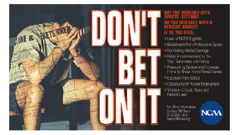 As part of the education effort, the NCAA has developed an informational poster -- "Don't Bet On It" (see page 1) -- that will be distributed in August to NCAA member institutions. Each member institution will receive five copies of the poster for display in athletics departments and facilities as well as for use in athletics programs and other publications, Saum said. Any institution wanting additional posters can contact the national office.