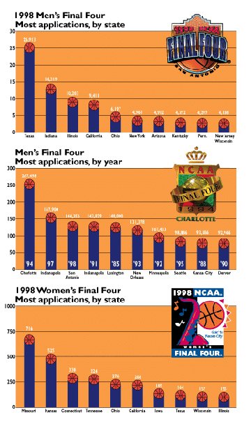 Notification has been provided to individuals in the general public who will receive tickets to the 1998 Men's and Women's Final Fours. Thousands of people submitted applications for both events earlier this year. Those whose names were not selected have been provided with refund checks. About 144,300 entries were received for the Men's Final Four, which will be played March 28 and 30 in San Antonio. That is the third-largest number of entries received. The Alamodome will seat about 40,500 for the event. Of that number, about 10,300 were allocated to the general public (25 percent). The remaining tickets are reserved for the participating institutions (35 percent), the host institution and local organizing committee (12.5 percent), representatives of the NCAA membership, such as conference commissioners, presidents and various committee members (13 percent), members of the National Association of Basketball Coaches (8.5 percent) and Division I member institutions (six percent). This was the first year for Women's Final Four tickets to be distributed through a random computerized drawing, although it has been sold out every year since 1993. Kemper Arena in Kansas City, Missouri, will seat about 17,500 for the Women's Final Four, and about 43 percent of those seats (7,500) have been designated for the general public. The remaining allocation: participating institutions, 16 percent; host conference and local organizing committee, eight percent; members of the Women's Basketball Coaches Association, 17 percent; and representatives of the NCAA membership and affiliated entities (Division I conferences, member institutions, committees and ESPN), 16 percent.